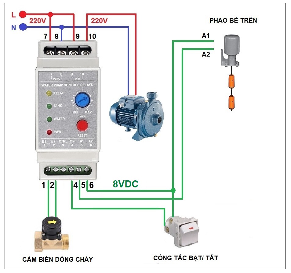 | Chức năng thiết bị | Rơ le điều khiển bơm nước an toàn |