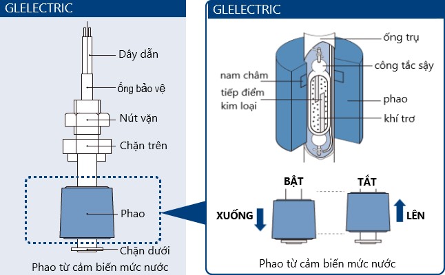 Phao điện từ cảm biến mực nước GLELECTRIC gồm 1 phao điện từ nổi PP có vỏ bảo vệ chống kẹt giúp phao điện từ hoạt động ổn định, chính xác hơn.