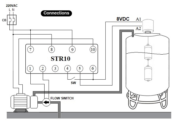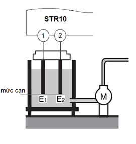 Khi mức nước trong bể chứa cạn, tiếp điểm A1, A2 của phao điện lắp tại bể chứa sẽ đóng mạch. Điều kiện này làm cho STR10 khởi động máy bơm và liên tục kiểm tra nguồn cấp nước vào máy bơm thông qua cảm biến dòng chảy hoặc đầu dò điện cực.