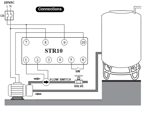 Rơ le điều khỉển máy bơm nước an toàn STR10 nhận tín hiệu kích hoạt từ công tắc phao điện tại cổng 5, 6 để bắt đầu một chu trình bơm nước.