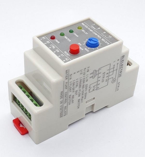 Rơ le điện tử điều khiển bơm nước STR10 hoạt động như một Rơ le an toàn cho phao điện + Rơ le thời gian và Rơ le mực nước. Ngoài các tính năng an toàn cho phao điện, STR10 còn được bổ sung tính năng an toàn cho máy bơm như: Tự ngắt máy bơm khi không có nước cấp vào và tự động bật bơm khi nguồn nước có trở lại. Tính năng này đặc biệt hiệu quả đối với trường hợp nguồn cấp nước vào máy bơm chập chờn, giúp nâng cao tuổi thọ của máy bơm và loại trừ nguy cơ chập cháy do máy bơm hoạt động mà không có nước.