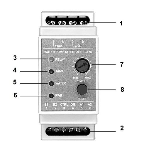 - Hoạt động như một tủ điều khiển bơm nhỏ gọn, với đầy đủ tính năng của Rơ le an toàn cho phao điện + Cảm biến mực nước + Rơ le thời gian.